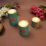 A set of exquisite handcrafted mosaic tealight candle holders. Each holder is adorned with intricate turquoise and gold-toned mosaic tiles, featuring a vibrant floral design at the center, accented with red and golden embellishments. These candle holders are perfect for adding a touch of elegance and charm to any space, making them an ideal choice for home décor, festive decorations, or gifting. Their artistic design highlights a blend of traditional craftsmanship and contemporary style.